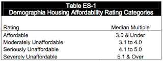 Demographia recently released its 8th Annual International Housing Affordability Survey: 2012 in which they measure the affordability of housing in seven nations including Australia, New Zealand, Ireland, Hong Kong, Canada, the United Kingdom and the United States. As I’ve noted on previous occasions, Demographia has a relatively unique way of measuring housing affordability by comparing the price of a median home to the gross (before tax) median annual household income in that market. By dividing the median price by the median income in a given market, Demographia ends up with the median multiple for that market which gives a sense of affordability. Historically, median multiples for the nations in the study have ranged from 2.0 to 3.0 with 3.0 being the upper limit of affordability. Demographia then takes the range of median multiples and breaks them down into one of four categories as shown on this chart: