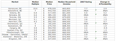 Canadians have been seeing a lot of speculation about the future of the country’s real estate market in recent months with "experts" falling on both sides of the fence; some saying that the market is fine, healthy and not due for any meaningful correction and others certain that the market is in for a big correction, especially because it is one of very few markets among developed nations that has not seen a price readjustment. In this posting, I will present pricing data, measured by affordability, showing which Canadian markets are most affordable and which real estate markets are out of teh reach of prudent consumers.