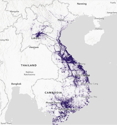 Let’s put some of the comments from the Vietnamese gentlemen into context. This map shows every bombing mission carried out by the United States during the Vietnam War between 1965 and 1973 (no data is available for 1974 since geographic co-ordinates are not available) with every point representing a single bombing mission: