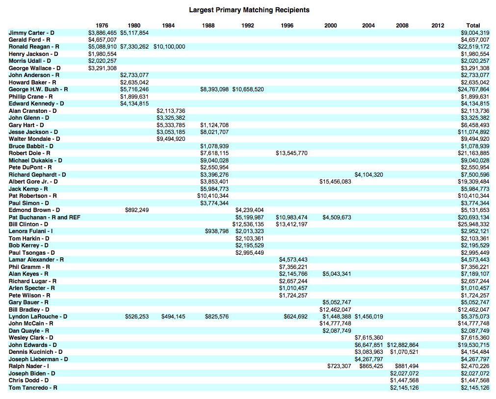 Here is a chart showing which candidates have received more than $1 million in primary matching funds since its inception: