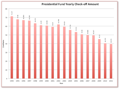 It is interesting to see just how much American taxpayers are on the hook for the cost of federal elections, especially party nominating conventions, particularly in this time of near-record deficit spending. It is also interesting to see how the number of taxpayers that are willing to allocate three of their tax dollars to this "worthy cause" has dwindled to a tiny fraction of what it was back in the halcyon political days of the 1970s and 1980s. Perhaps voters are becoming just a tad jaded. On the upside, however, as I said before, when you see that wonderful light and sound show and all of those attendees hopped up on Red Bull (among other things), please remember, "We did that!". Well, at least part of "that".