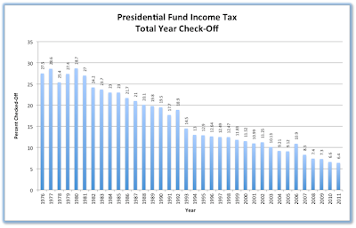 In the program's infancy, a significant portion of taxpayers checked off the little box on their tax returns however, as the years have passed, the number of participants has decreased markedly as shown on this graph: