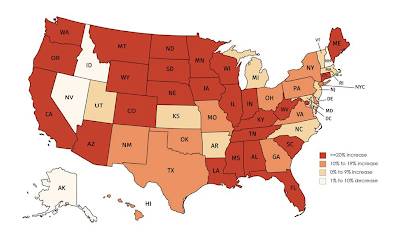 Now, let's take a brief look at the percentage change in all drug overdose deaths on a state-by-state basis over the 12 month period ending in May 2020: