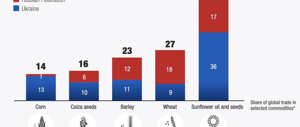 The Russian invasion of Ukraine has the potential to significantly worsen the world's food production and price situation. According to the FAO, at least 12 percent of the world's food calorie exports pass through the Black Sea region. A recent report from the United Nations Conference on Trade and Development (UNCTAD) assess the impact of the military operations in Ukraine on trade and development given the fragile state of the global economy, particularly given the importance of both Russia and Ukraine to the world's food supply: