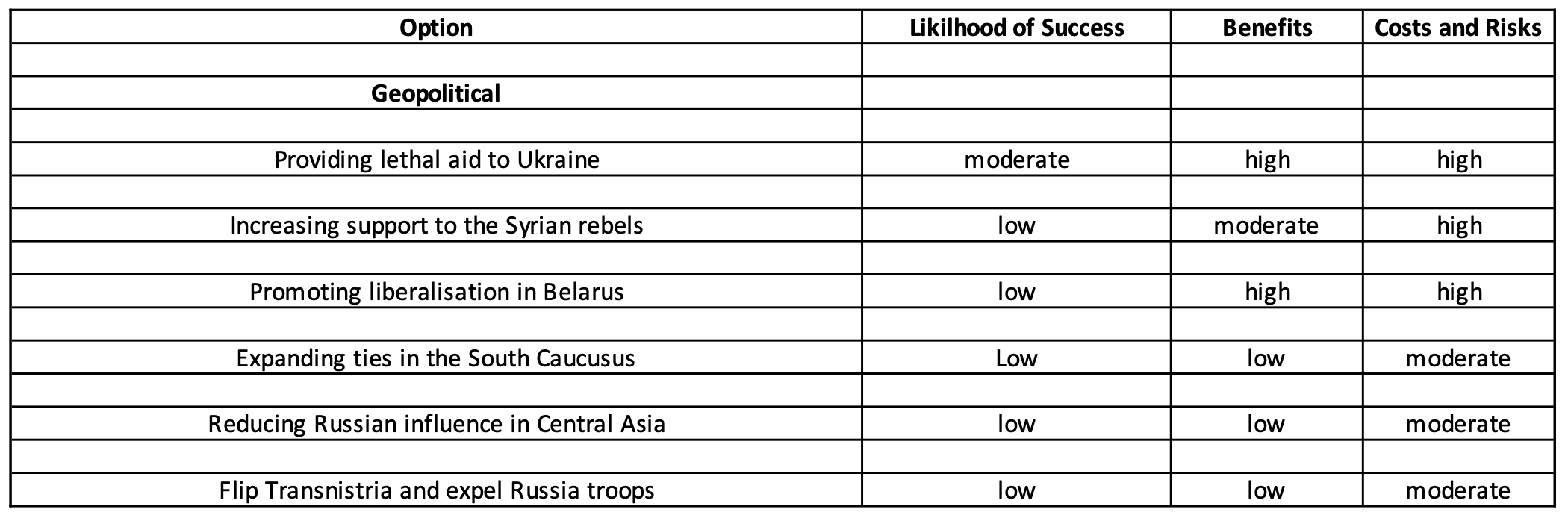 2.) Geopolitical cost-imposing options which includes providing lethal aid to Ukraine, increase support to Syrian rebels, promoting liberalization in Belarus, expanding ties in the South Caucasus, reduce Russian influence in Central Asia, flip Transnistria and expel Russian troops from the region.