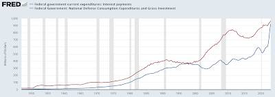 As an aside, given that the United States is by far the biggest spender on defense when compared to other nations, it is interesting to see that spending on defense, the biggest single line item on Washington’s annual budget, is now roughly the same as spending on debt interest payments: