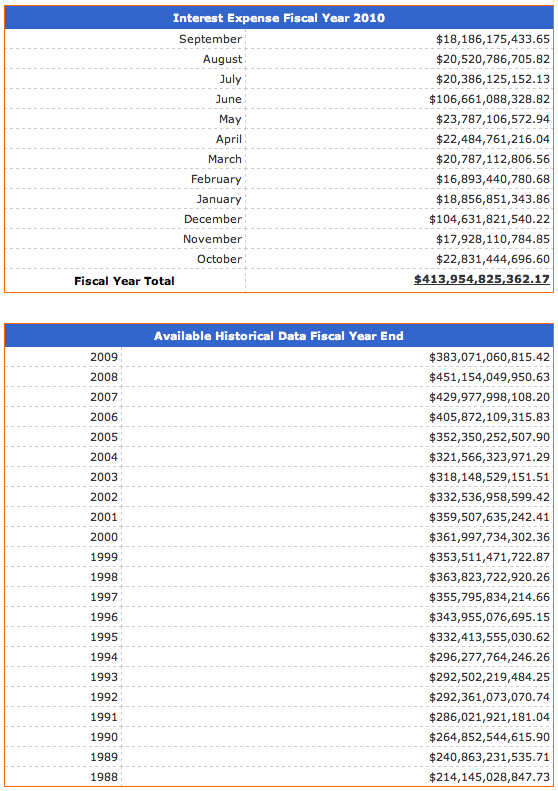 What is particularly frightening about the United States debt situation is the growing interest on the debt. Here’s a screen capture from the TreasuryDirect website showing the interest on the debt for fiscal 2010 as well as historical data back to 1988: