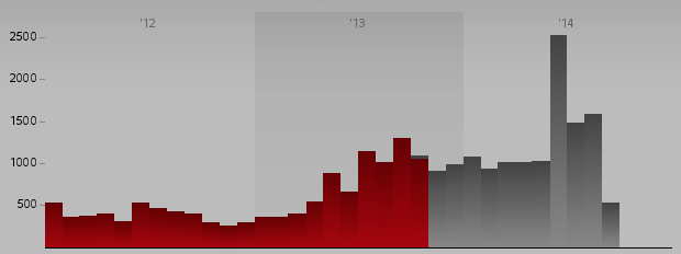 Let's summarize the impact of ISIS on Iraqi civilians. From IraqiBody Count, here is a graph showing the growth in the number of civilian casualties from 2012 to 2014: