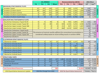 With the new data in hand, the USGS recalculated the statistical volume of recoverable oil and natural gas. Here is a rather busy table showing the brand-spanking new 2010 vintage USGS estimates: