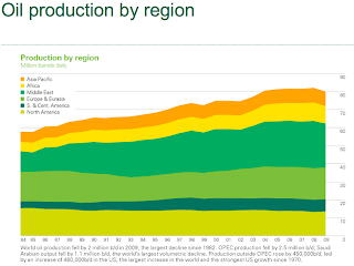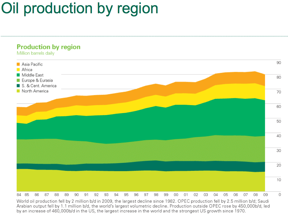 Perhaps BP’s Statistical Review of World Energy has shown us this graphically for several years. Here’s a graph showing basically flat production from the Middle East over the past 10 years and, by the way, Saudi Arabia’s oil production peaked at 11.114 million BOPD in 2005 and was 9.7 million BOPD in 2009: