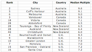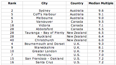 The most severely unaffordable housing was found in Hong Kong which had a median multiple of 11.4. This has only been exceeded twice before in the seven years that Demographia has issued their report, both times by Los Angeles which came in at 11.5 in 2007 and 11.4 in 2006. Here are the three most unaffordable markets in each nation (other than China/Hong Kong). Notice how housing is extremely unaffordable in the least affordable markets in Australia compared to the overpriced markets in the other four nations: