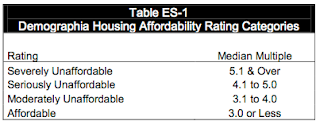 Demographia defines affordability as the median multiple as calculated by dividing the median house price by the gross annual median household income in that market. The median multiple is then divided into affordability rating categories as follows: