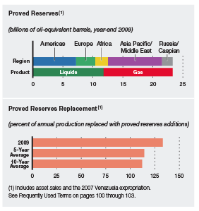 "The corporation’s reserves additions in 2010, the highest since the merger of Exxon and Mobil, reflect strategic acquisitions, new developments, as well as revisions and extensions of existing fields resulting from drilling, studies and analysis of reservoir performance. Reserves additions from acquisitions and subsequent revisions totaled 3 billion oil-equivalent barrels. Additions also came from the Sakhalin-1 Arkutun Dagi project in Russia and other countries including Canada, the United States, Nigeria, Norway and Abu Dhabi. Liquid additions totaled 905 million oil-equivalent barrels for a 102 percent replacement ratio and gas additions totaled 2.6 billion oil-equivalent barrels for a 328 percent replacement ratio.